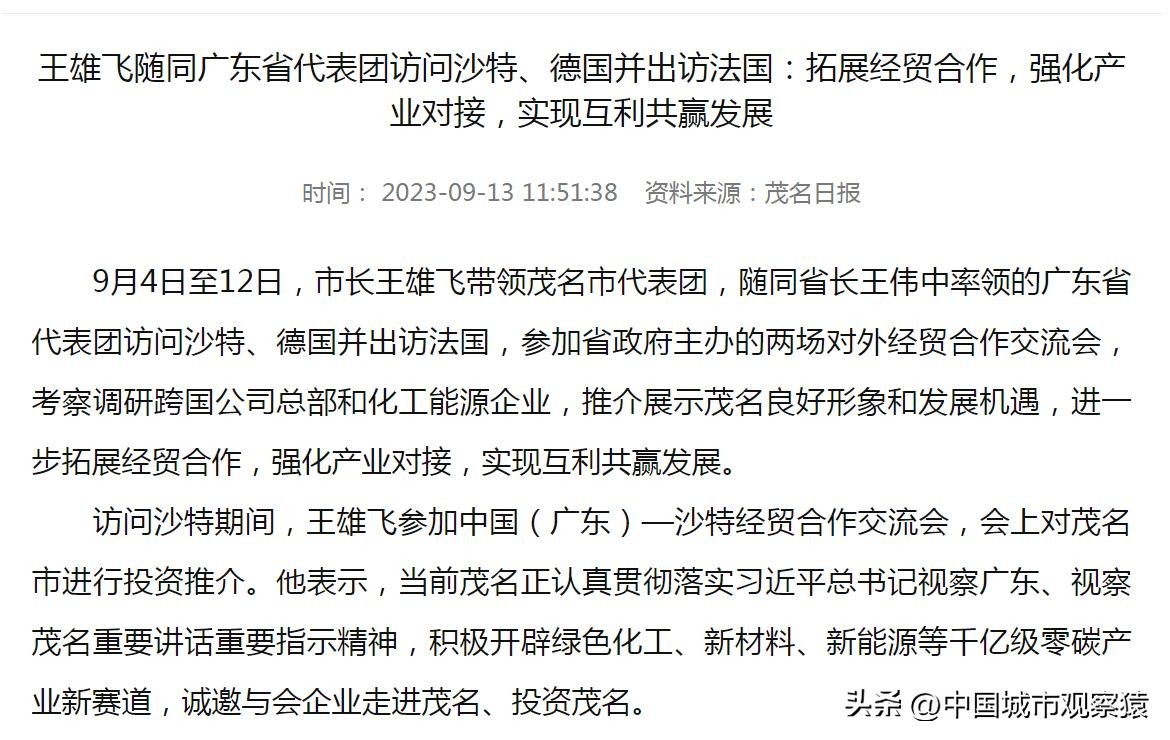 2023年9月4日至12日,茂名市长王雄飞带领茂名市代表团,随同省长王伟中率领的广东省代表团访问沙特、德国并出访法国。