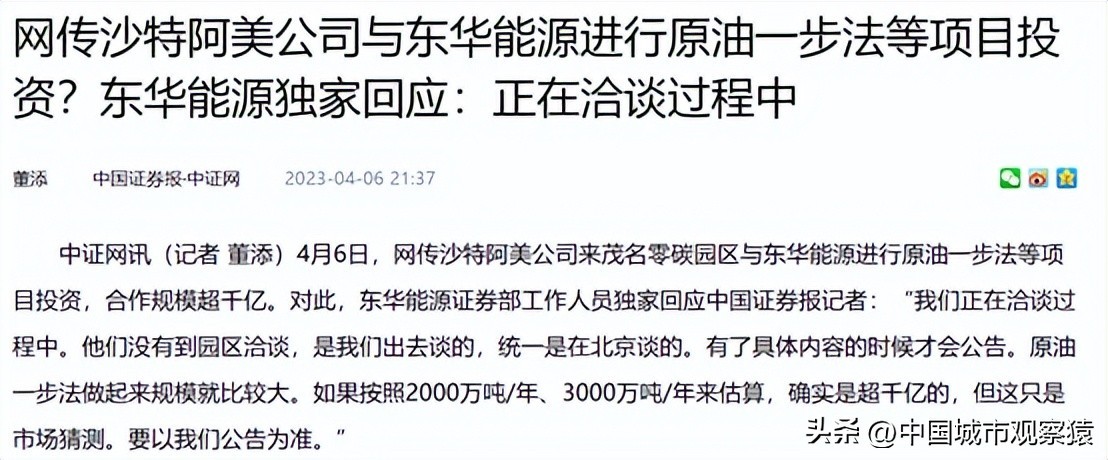 与此同时,网传沙特阿美公司来茂名零碳产业园与东华能源公司进行原油一步法等项目投资,合作规模超千亿元的消息。东华能源的高层表示,目前东华能源正在和一家世界著名化工企业积极洽谈合作中。“对方得知茂名在打造零碳产业园,区别于其他产品和行业,用地理标识对抗碳税,就计划和我们合作投资原油一步法制化学品项目,转化率将超80%,这属于全球首创”