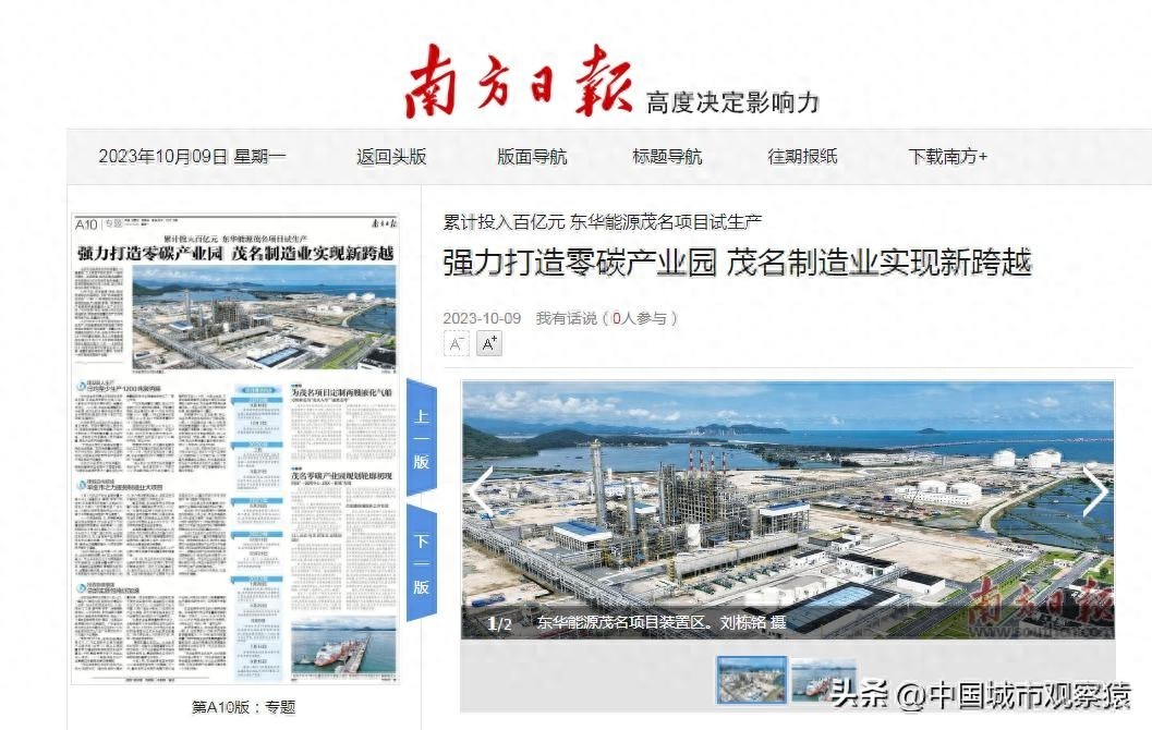 2023年10月9日《南方日报》A10版一整版报道了茂名关于打造零碳产业园的相关内容。标题为:累计投入百亿元,东华能源茂名项目试生产,强力打造零碳产业园 茂名制造业实现新跨越