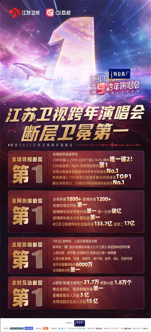 整台晚会全维度数据夺冠,断层卫冕第一!全域收视断层第一。CSM35城收视2.259%,CSM71城收视2.163%,CSM全国网1.366%,所有网别排名第1,是省级卫视71城、35城唯一破2的跨年晚会。欢网大数据全国直播收视率多时段排名第一,收视峰值2.74%,位列省级卫视跨年晚会收视峰值TOP1。酷云同时段52、55城实时收视峰值收视排名第一;全网热搜断层第一。晚会获全网热搜超1800次,其中微博热搜超1200次,热搜在榜总时长第一,在微博端有关跨年晚会的讨论热度位居第一,在微博跨年狂欢节预约唯一破亿、排名第一,微博跨年晚会讨论量热度第一,#江苏卫视跨年#主话题阅读133.7亿;全程影响断层第一。主流媒体点赞第一,1月1日上午,新华社、人民日报首发点赞,新华社以澳门和内地青年共唱的《七子之歌》节目,祝福澳门明天更好,人民日报官方微博转发李宇春演唱的歌曲《回春天》,迎接2025第一缕春意。12月31日晚,人民日报微博、抖音、视频号、客户端、视界、B站、百家号等全平台直播,观看人次超6000万;全时互动断层第一。江苏广电总台全新推出的视频客户端“ai荔枝”新增注册用户21.7万,用户自制的“明星to签”海报数量超1.8万,晚会全网长、短视频播放量第一整台晚会直播观看总人次破3亿,全网话题总互动人次超15亿。
