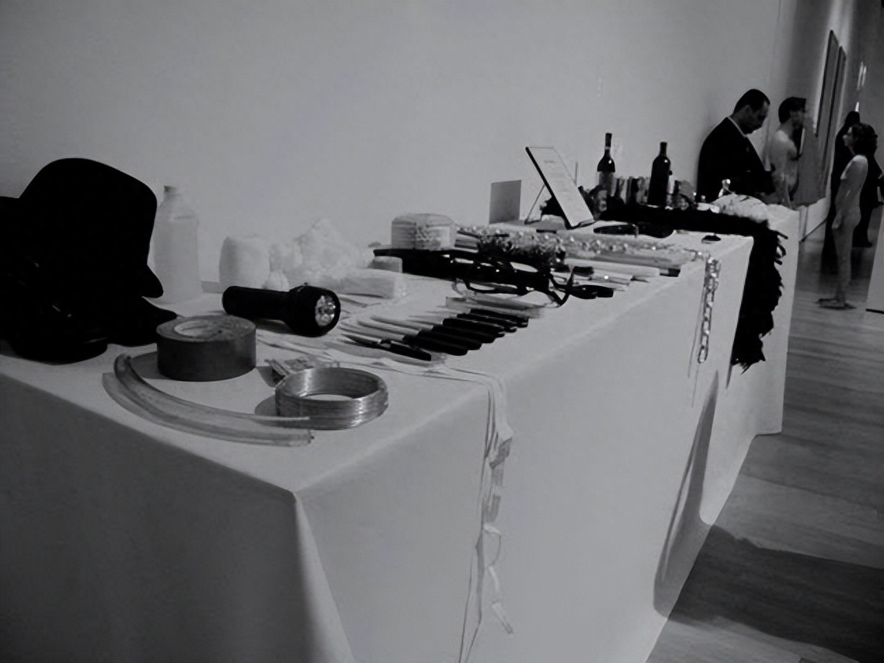 “在我处于麻醉状态下的6小时时间里,观众可以随意挑选道具与我的身体进行接触,为此产生的一切后果都不需要承担责任。”