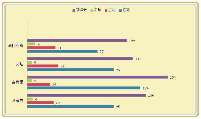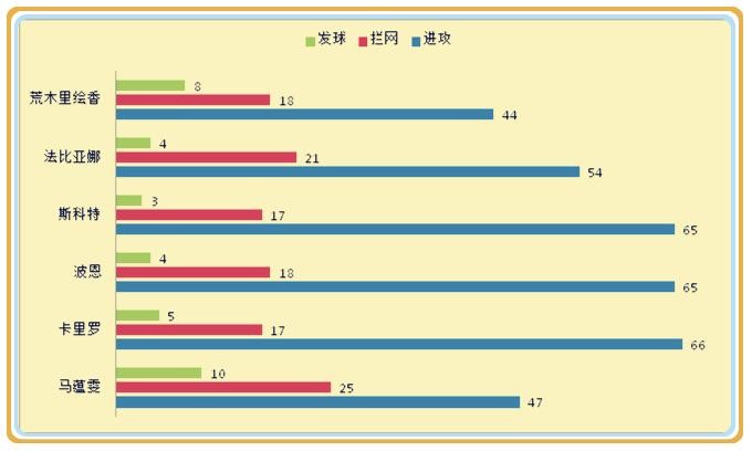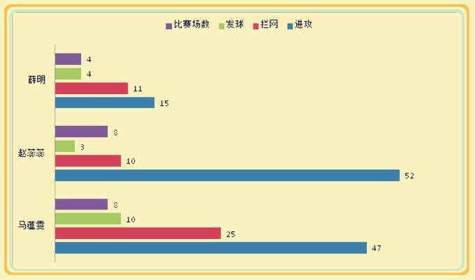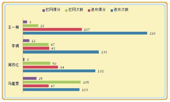 2、拦网出色,超出教练预期,作为三点副攻,当马蕴雯与周苏红和李娟轮到前排时,马蕴雯主要担负拦网和掩护任务,进攻并不是头等职责,统计数据显示,马蕴雯共计拦网105次,比周苏红的50次和李娟的47次要高出一倍以上,拦网得分达到25分,同样比周苏红的3分和李娟的12分要高出很多,显示出马蕴雯在拦网端的积极、主动,阻击效果十分明显。同时通过不惜体力的战术跑动和起跳,为2、4号位的进攻创造条件,通过积极的掩护和扯动,减轻周苏红和李娟的进攻压力。
