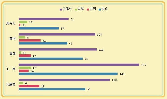 1、成为中国女排最重要、最稳定的得分点,本届世锦赛王一梅、马蕴雯共计得分分别为172和130,得分榜排名第9和第21位,队内排名前二。值得称道的是马蕴雯的进攻成功率达到53.37%,排名扣球榜的第2,仅次于科舍列娃的53.88%,马蕴雯的进攻成功率也是当时世界各国副攻最高的,比08奥运会时又提升了一大步。拦网威力不减,以局均0.78个得分排名拦网榜第6,中国女排队内第2,仅发球排名比08奥运会有所退步,局均发球得分由0.33滑落到0.16。但马蕴雯在中国女排极其困难的形势下,打出了自己的水平,成为中国女排混沌迷乱中不多的亮色。