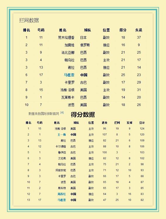 4、具备与世界最强副攻比拼的实力,北京奥运会上表现突出的副攻是古巴的卡里罗、美国的波恩和斯科特、巴西的法比亚娜、日本的荒木绘理香,她们总得分排名分别是第9、10、11、17、20,马蕴雯排名第13,与卡里罗、波恩和斯科特不相上下,比法比亚娜和荒木排名要好。马蕴雯拦网局均0.83分,仅次于荒木的0.86和法比亚娜的0.84,比卡里罗和波恩要好。发球方面仅有马蕴雯和荒木进入发球榜的前十。综合当时风头最劲的几位副攻,马蕴雯与世界一流副攻相比可以说是旗鼓相当,不分仲伯,马蕴雯应该是本届奥运会最佳副攻的有力人选,是继赵蕊蕊之后中国女排又崛起的一名顶级副攻。