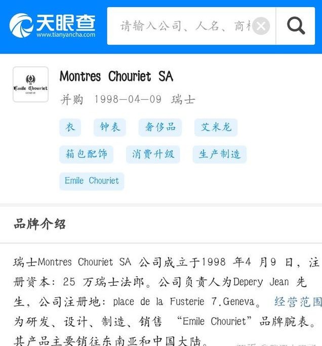 它是一家香港注册的私人公司,注册资本是50万港币,它100%持有瑞士Montres Chouriet SA 公司和艾米龙这个品牌。