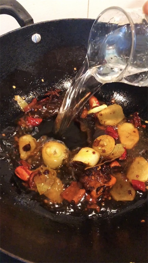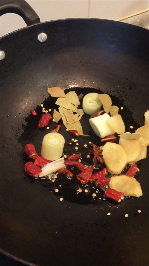 6.油热下去葱姜干辣椒香叶,桂皮,八角炒出香味