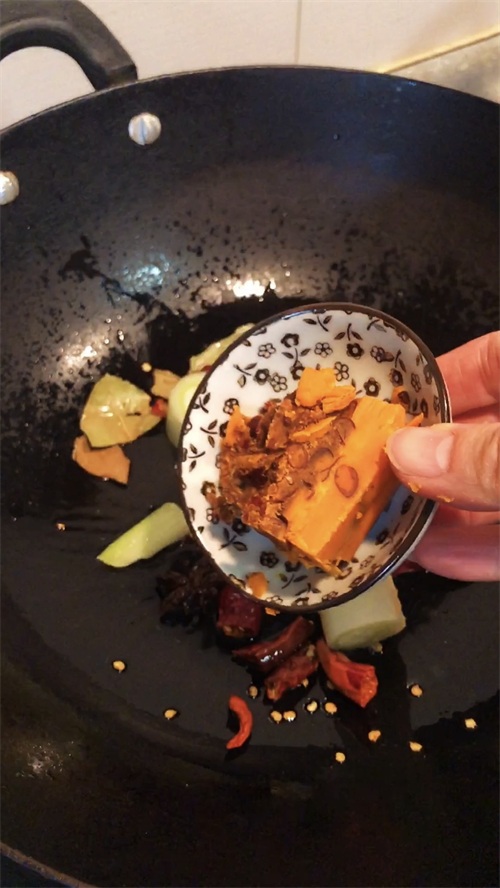 7.放入一块火锅底料炒出红油