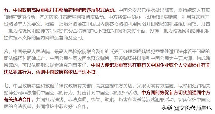 公告中指出,在菲的中国公民请勿参与任何形式BC的活动中。与此同时,我使馆也敦促菲政府切实保障在菲的中国公民的合法权利