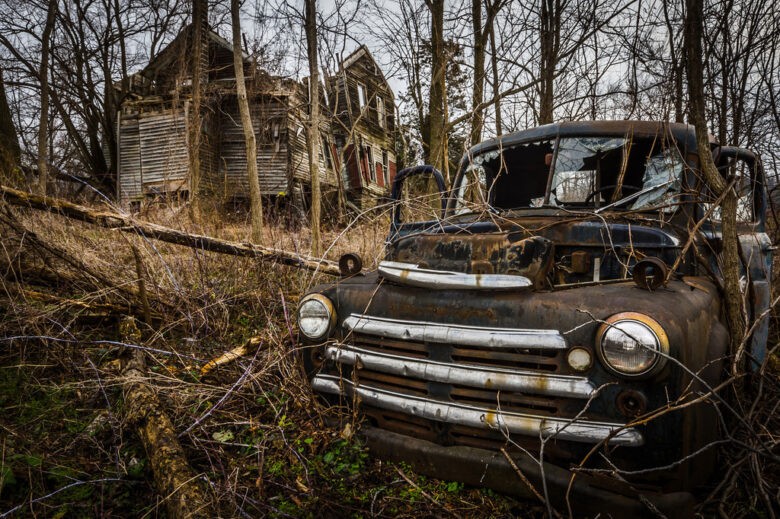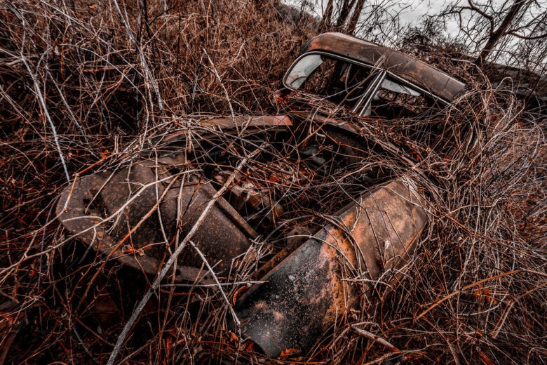 整个场地被毒藤和四英尺高的荆棘灌木覆盖。这座废弃的农舍在纽约州还充当着许多老式汽车的墓地,这些车辆如今只剩下空壳,使得这个地方显得更加阴森。