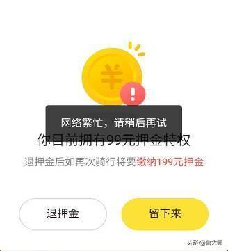 部分小黄车用户跟帖表示担心,“赶紧把押金退出来。”不过想退个押金也不容易,先是“退押金”按钮被隐藏,用户很难找寻。退款前更是遭到了n番挽留,“你现在退押金(99元)的话,以后再想骑小黄就要交更贵的押金(199元)了”……
