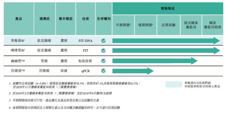 目前,诺辉健康有常卫清®、噗噗管®两款结直肠癌筛查产品已获得国家药品监督管理局的批准并开始正式商业化,两款产品形成互补效应,协同覆盖不同风险水平的结直肠癌筛查目标人群。2021年1月15日,常卫清®技术进入中国首个国家级癌症筛查指南。《中华肿瘤杂志》发布《中国结直肠癌筛查与早诊早治指南(2020,北京)》,明确推荐多靶点粪便FIT-DNA联合检测技术为肠癌早筛的重要手段之一。此外,公司还拥有覆盖胃癌、宫颈癌的在研产品管线幽幽管TM和宫证清TM。基于粪便的自检胃癌筛查产品幽幽管TM已于2020年11月向国家药监局提交注册申请;非侵入性家用尿液宫颈癌筛查测试产品宫证清TM,预期将于2021年启动注册临床试验。