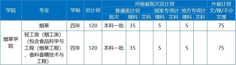 河南农大是我国最早开设烟草本科专业的大学,其烟草学院由中烟总公司和河南农大共同建设,开设了烟草、食品科学与工程(烟草工程)、香料香精技术与工程三个本科专业。2023年共招生240人,其中省外招生150人,烟草和烟工类在河南省内均是本科一批次录取,其中烟工类2022年在河南的最低录取分538分,录取位次是75105,2023年录取分可能在550分以上,烟草专业在560分以上。