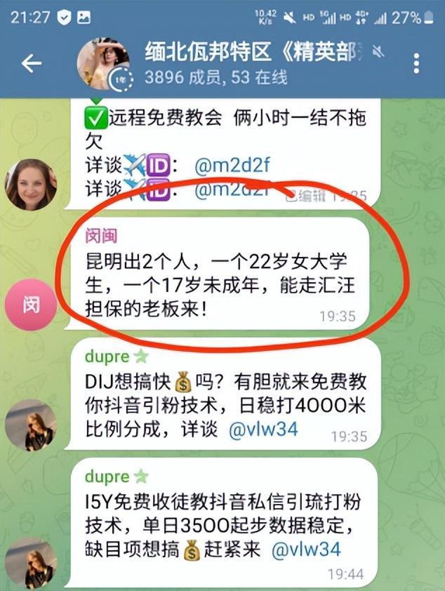 8月15日晚,社交平台上曝光了一起涉及人口贩卖的严重事件。根据网友在一个名为“缅北佤邦特区《精英部落》”的群聊中的聊天记录显示,一位名为“闵闽”的网友发布了一条关于昆明有两个人要卖的消息。这两个人分别是一名22岁的女大学生和一名17岁的未成年人。据称,交易可以通过汇汪担保的方式进行。很快,一名买家联系了“闵闽”,询问女孩的价格。