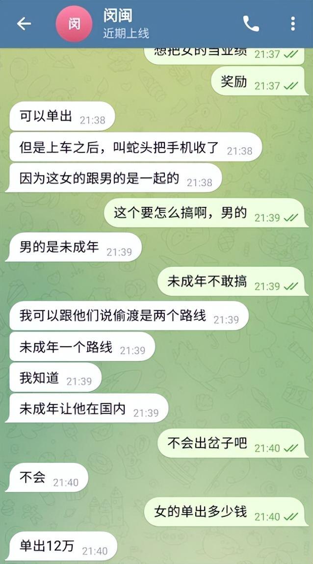在聊天过程中,双方多次提及与人口贩卖相关的词语,如“猪仔”、“蛇头”、“偷渡”等。根据“闵闽”的说法,女大学生李某的价格是12万元。如果买家不想要未成年男孩,就只会将女大学生带走,男孩将被留在国内。最后,"闵闽"强调这两人必须在明天送走,并安排了一个群聊,以及“蛇头”来接人。