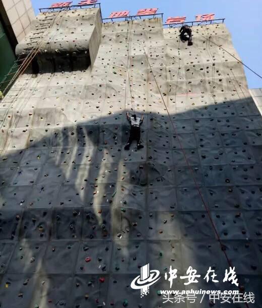 走进合肥最大的户外攀岩馆——庐阳区新天地攀岩场,可以看到,岩壁高有40米左右,内设儿童攀爬区、新手体验区、绳降体验区、辅助训练区等,设施很齐全。