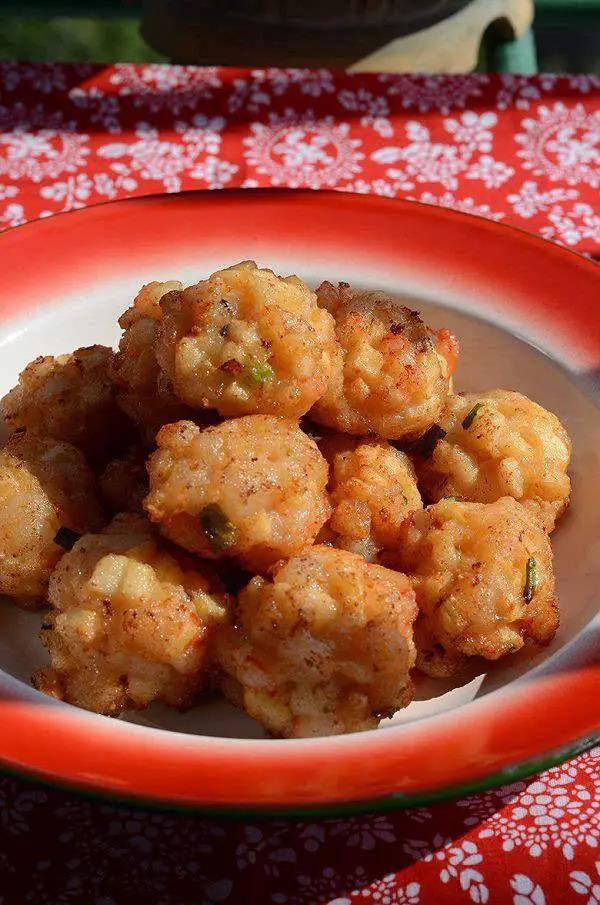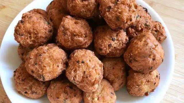 3、锅内加植物油烧热,将鱼馅下成丸子,入油中炸熟呈金黄色,食时蘸花椒盐