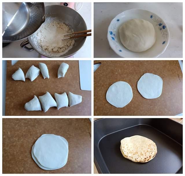 做法:300克面粉加少许盐,慢慢加入200克左右的热水,揉成一个光滑的面团。我偷懒,用的是揉面机,面团尽量软一些。揉好的面团盖上保鲜膜,静置半小时以上。如果是早餐吃,也可以提前一晚上揉好,放冰箱静置,第二天早上直接擀开做烙饼。