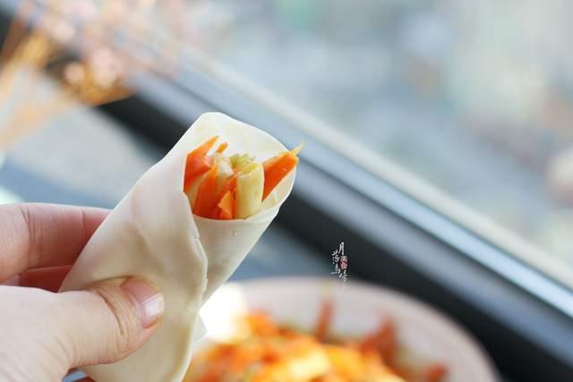 春饼卷上鸡肉、胡萝卜和生菜,开吃。