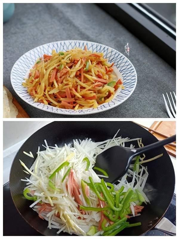 鲜笋先用水焯一下,再切丝,萝卜、青椒、香肠也切丝,所有材料翻炒均匀,加盐、酒、酱油调味,简单又好吃。