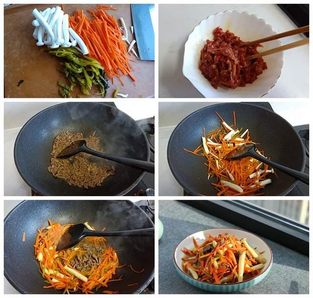 主要由青菜、蘑菇、胡萝卜、肉丝组成,先炒肉丝,再炒蔬菜,加盐、酒、酱油调味。