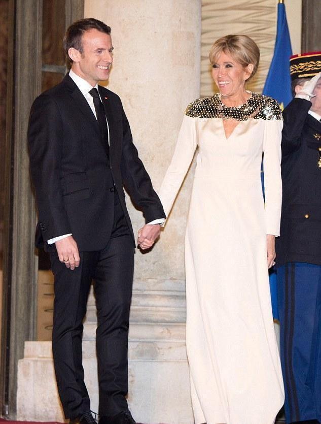 两人坐在一起54岁的布吉丽特明显比30岁的马克龙看起来苍老许多,但是马克龙丝毫不介意,轻轻握住妻子的手臂像是在宣告众人:她已经是我的妻子了。