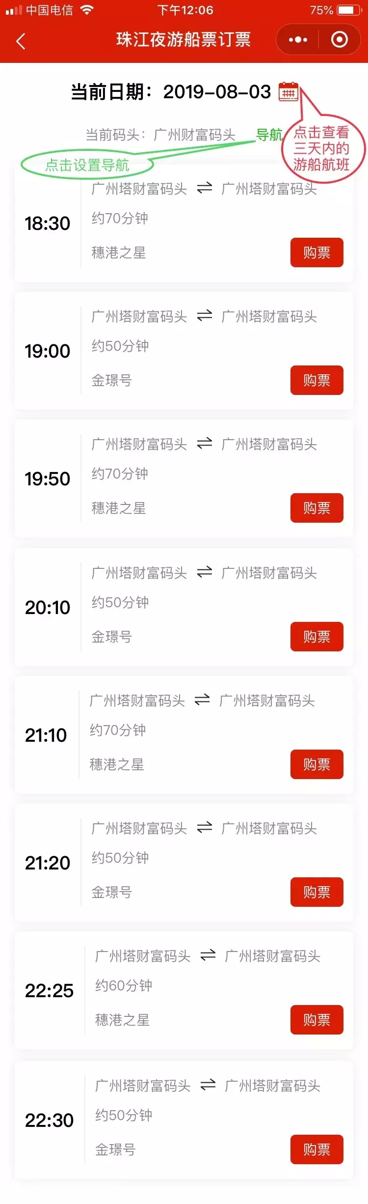 进入这个页面后,游客朋友可以很清楚的看到自己跟各个游船码头的距离,然后根据自己所在的地理位置、出行便利条件、游玩时间安排、个人对不同游船的喜好、资金预算等因素选择最适合自己游玩的登船码头,购买该码头的珠江夜游船票。