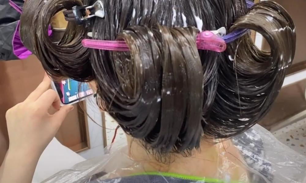 如果需要用焗油机或者红外线机进行加热,必须先把头发按照图片中的方法,打成空心卷,再用夹子固定。这样加热的时候,头发才能充分吸收热量,获得最佳的护理效果。