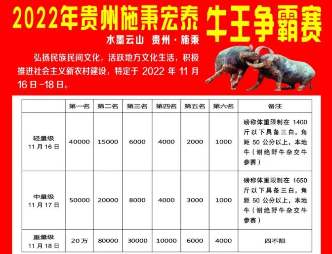 “奖金高了,观众才多嘛。”黔南布依族苗族自治州贵定县一位斗牛从业者刘杰(化名)介绍,在贵州,一年四季都会举行斗牛比赛,当地在月底也即将举办一场比赛,预计会有五六千位观众到场观看,“奖金高的话门票就是100块这样,低的话就30、50块钱一张。”