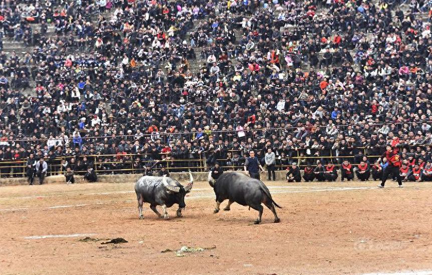 △2018年2月25日,贵州黔东南,当日是农历正月初十,从江县下江镇归江斗牛塘举办盛大斗牛活动,来自黔桂42头牛王前来参加角逐,引来数万观众前来观看。来源:视觉中国
