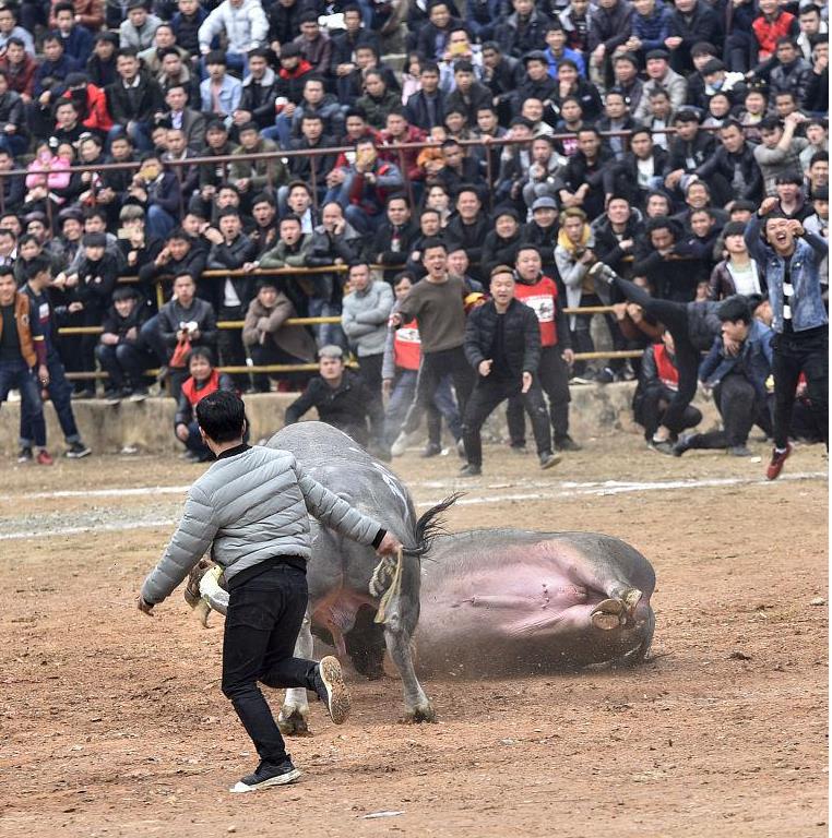 喝过烈酒和红牛的水牛受酒劲的鼓舞再加上一旁引斗者的挑拨,一场厮斗马上被点燃。到了赛场上,一头牛想要夺得牛王宝座,往往要进行一个小时甚至更久的殊死搏斗。杨先生说,在赛场上,主人看到牛受伤会心疼,有时会中途叫停比赛,相当于弃权。