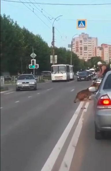 在伊万诺诺沃司机们目睹了一只老虎从堵车的道路中间逃跑的过程。一开始,这只老虎和主人平静地坐在车上,但是过了不久老虎突然从车里跳到了马路中间。