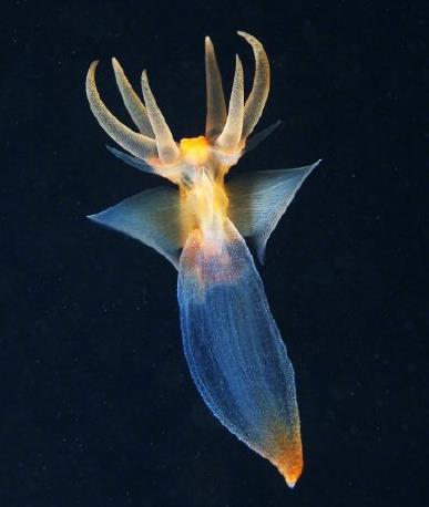 近日,俄罗斯地区的潜水员在白海冰下拍到了一种罕见的浮游生物——裸海蝶,这样一种奇特又美丽的软体动物一下就吸引了无数人的目光。它们生活在极度寒冷的两极地带,处于海洋浮冰下400米左右的地方。它虽是属于海若螺科类的一种,但它们在很小的时候就脱离了外壳,因为这样便于它们在海洋中任意浮游舞动。在游动的时候,它会挥舞着身体两侧的一对小翅膀,加上自身透明的外表,看起来就像一个翩翩起舞的"海天使"。