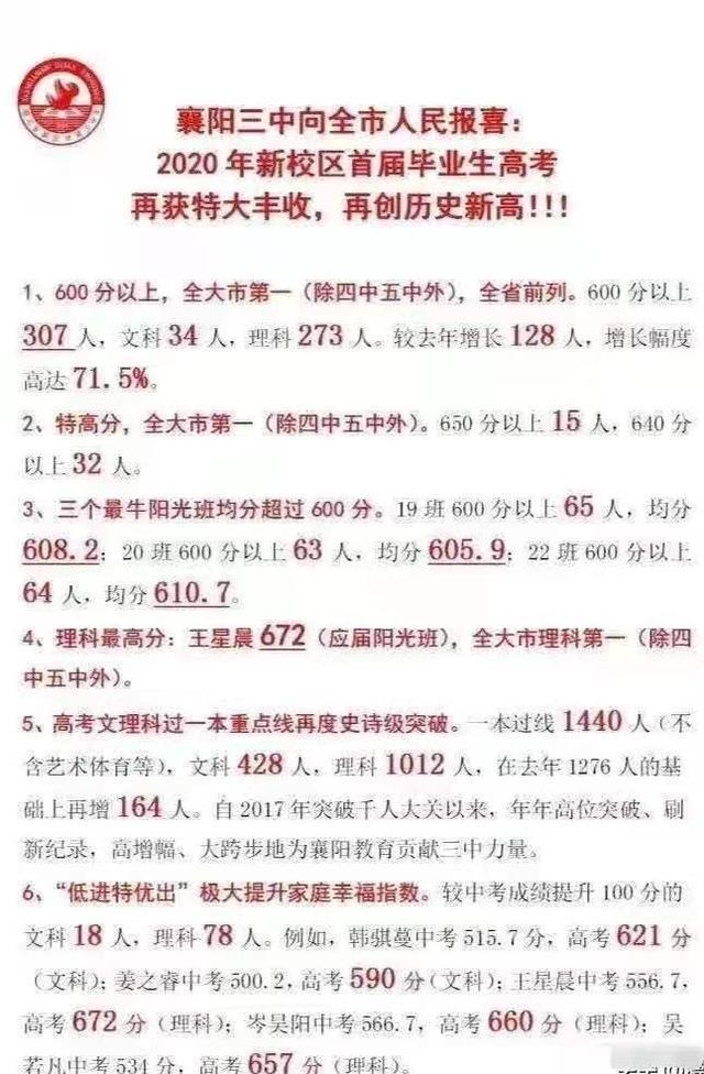 理科最高分:王星晨672(应届阳光班),除四中五中外,全大市第一。高考文理科过一本重点线再度史诗级突破。一本过线1440人(不含艺术体育等),文科428人,理科1012人,在去年1276人的基础上再增164人。