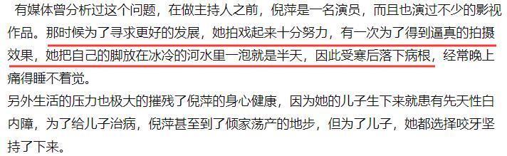 还有一种说法是倪萍经历了几段不幸的婚姻,要边工作边照顾一出生就患眼疾的儿子,身心压力太大,进一步造成了双腿病痛加剧,久而久之就落下了治愈不了的病根。