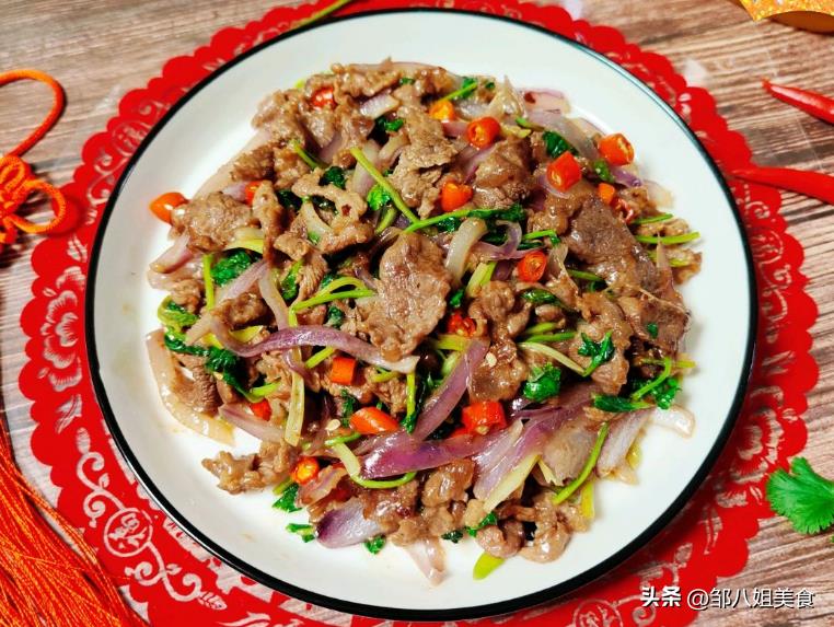 最后倒入牛肉、香菜、小米椒翻炒均匀,再加入生抽、鸡精翻炒几下,这道菜就做好了。