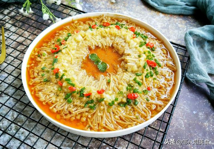锅内加油,烧热后放入蒜末,小火炸出香味,将蒜蓉浇在金针菇上,再倒入料汁。