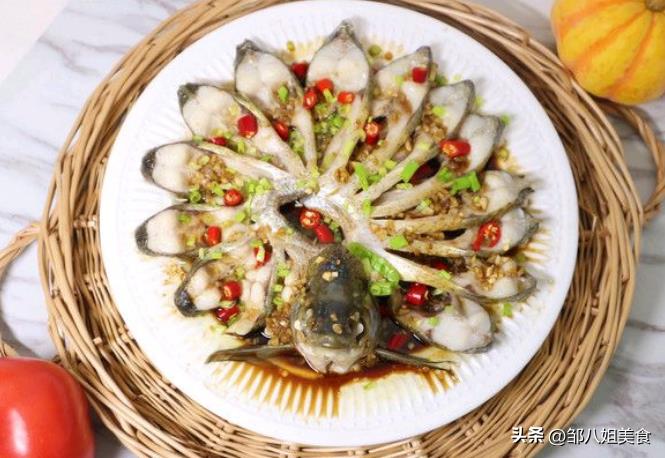 放入蒸锅蒸十分钟,蒸好后去掉葱姜和汤汁,再放入新鲜葱丝、红椒丝,浇上热油,淋上蒸鱼豉油,这道菜就做好了。