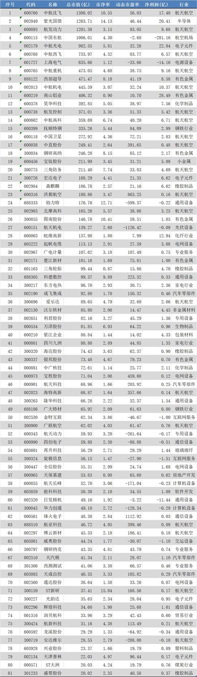 在A股市场中,共有81只国产大飞机概念股,其中前10大龙股是:
