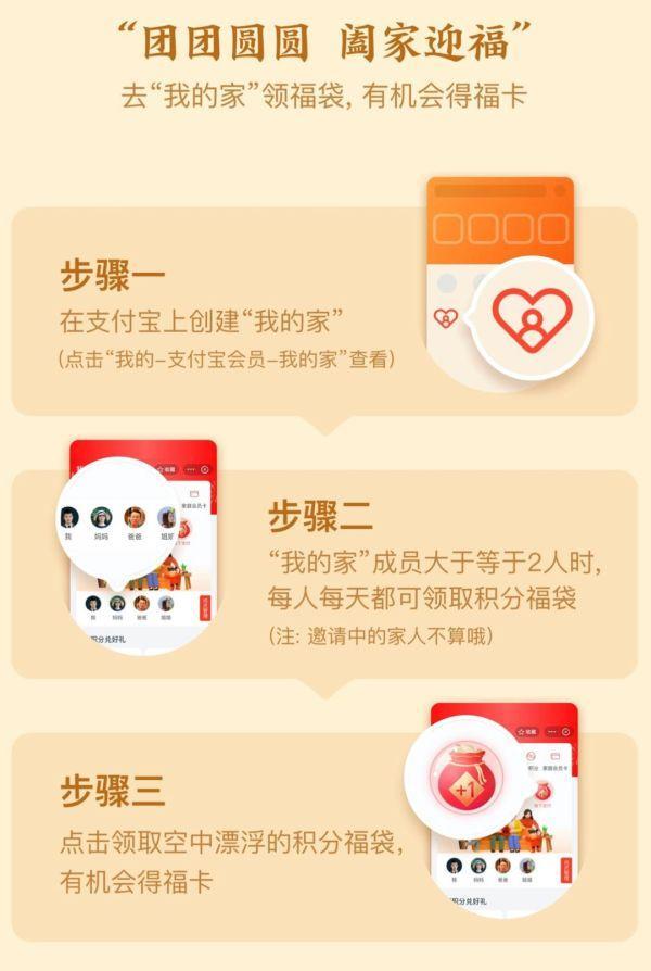 进入“我的家”,点击画面上方的“每日签到”福袋,就能获得一张福卡。