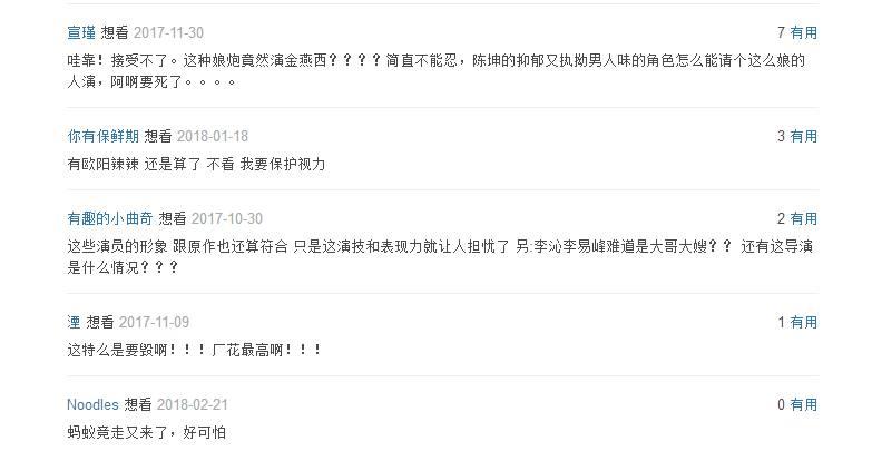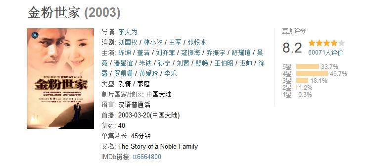 另外,新剧翻拍,老版的评分也会相应的有所变化。在此立一个flag,现在《金粉世家》的评分是8.2分,等到真的出了新剧,我估计能到8.4分!大家觉得呢?留言回复一下,等新剧播出了,再回来看一下,猜中了的可以好好地装个预言帝的逼了!
