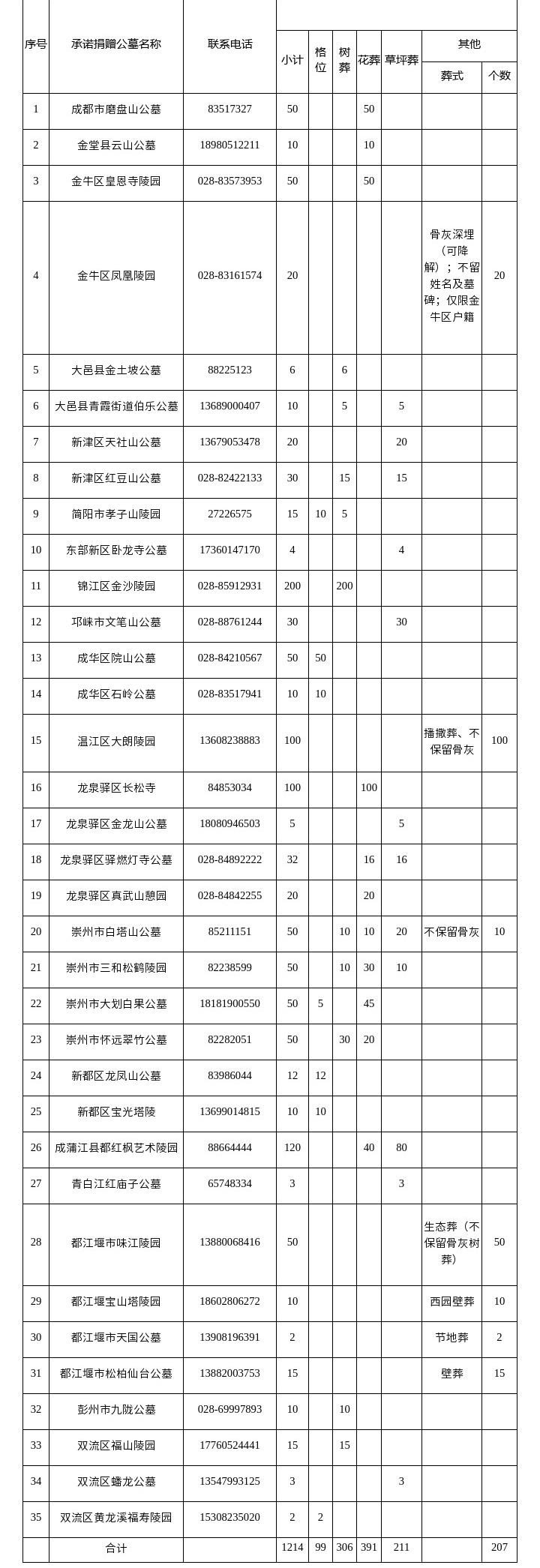 2021年成都市公墓节地生态葬公益捐赠穴位统计表