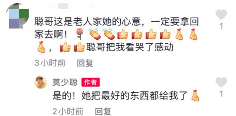 不少网友们看到此情此景被感动,纷纷在评论夸赞莫少聪,劝他不要辜负老人家的心意,把这些东西都拿回去。