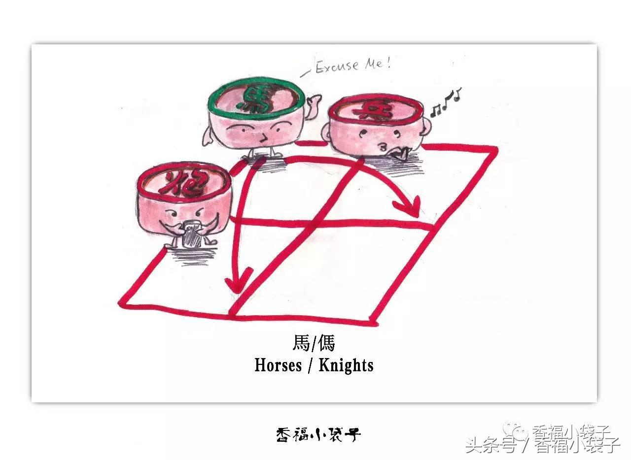 马走动的方法是一直一斜,即先横着或直着走一格,然后再斜着走一个对角线,俗称“马走日”。马一次可走的选择点可以达到四周的八个点,故有“八面威风”之说。如果在要去的方向有别的棋子挡住,马就无法走过去,俗称“蹩马腿”。