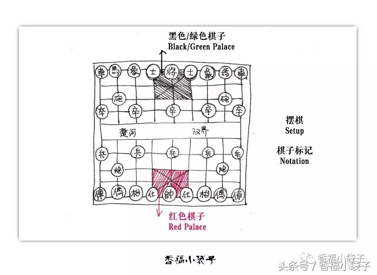 对弈开始之前,红黑(绿)双方应该把棋子摆放在规定的位置【Setup】。