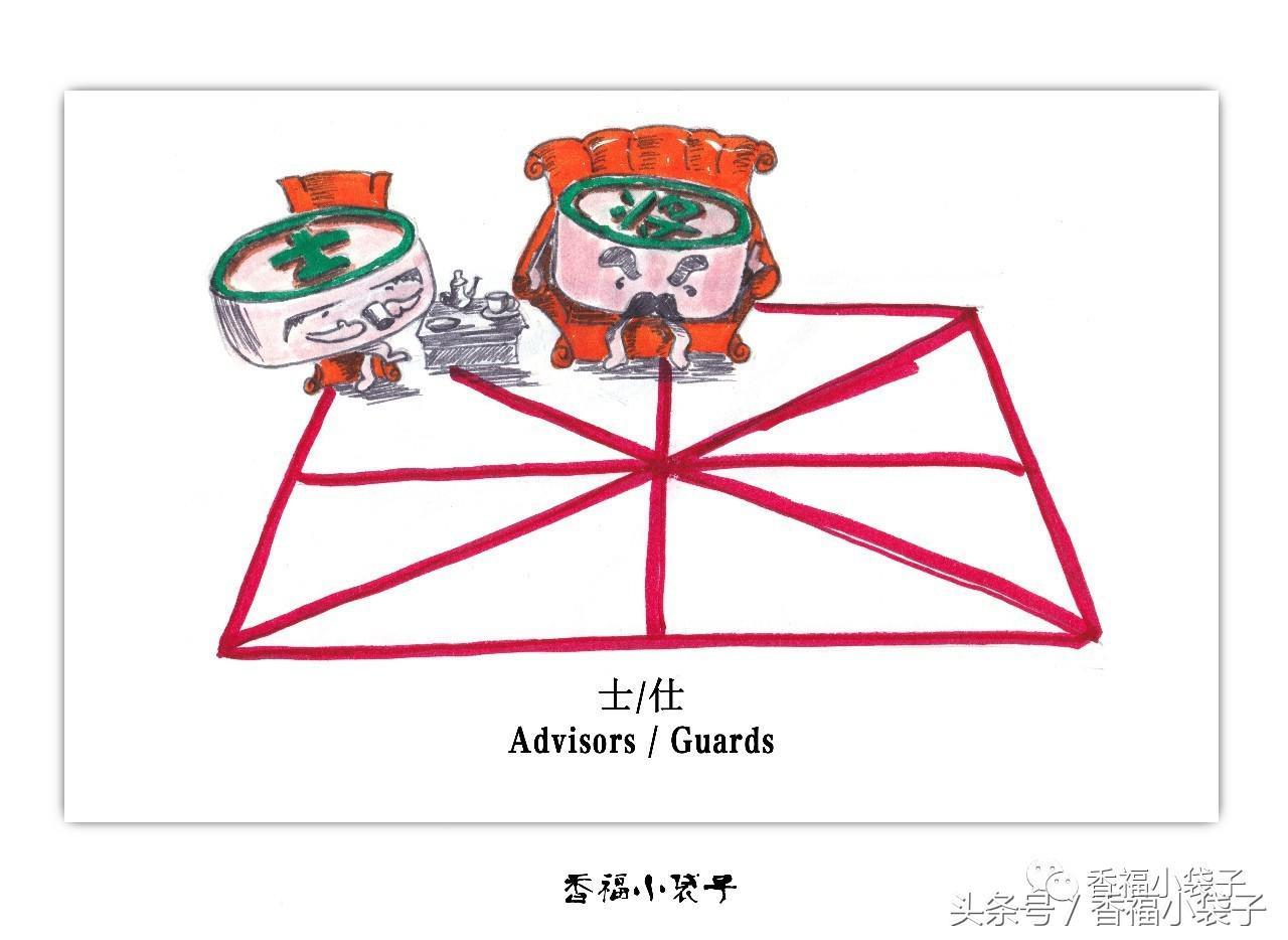 红方为“仕”,黑方为“士”。它也只能在九宫内走动。它的行棋路径只能是九宫内的斜线。士一次只能走一个斜格。