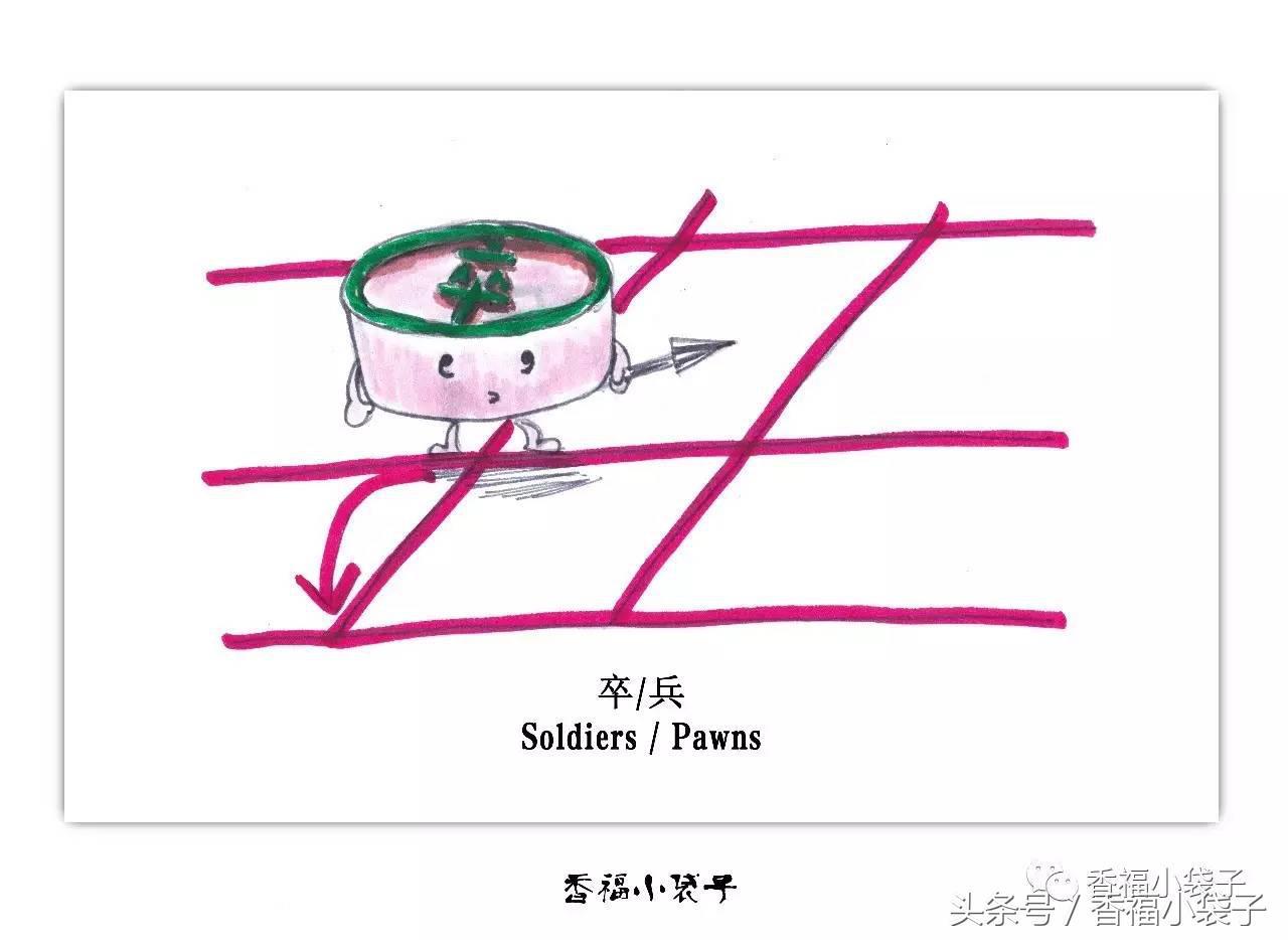 兵(卒)只能向前走,不能后退,在未过河前,不能横走。过河以后可左、右移动,但也只能一次一步,即使这样,兵(卒)的威力也大大增强,故有“过河的卒子顶半个车”之说。
