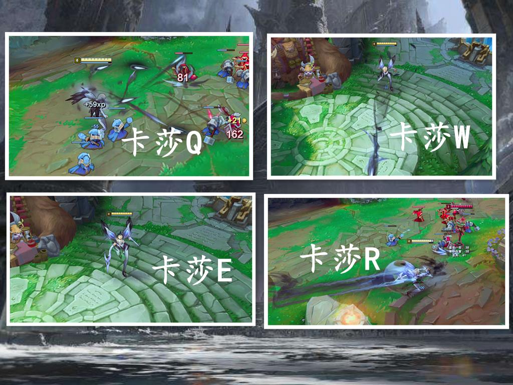 卡莎Q技能的电浆,被黑色的锋利羽毛所代替,乍一眼看去会把它当做霞。W是发射出一束黑色的能量,颜色比较深,技能的打击感应该不错。而E技能设计得比较细节,在卡莎半蹲潜行后,会戴上银色的眼镜,看起来很酷炫。R技能则是从较远的地方,快速移动到敌人附近,身后是较淡的黑色轨迹,像墨水。