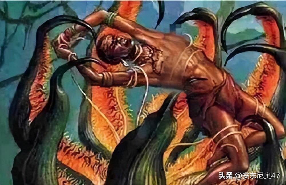 当那名妇女被迫接触到那如海带一样的叶子时,恐怖的事情发生了,只见那些树叶突然狂舞起来,像章鱼的触须一样伸过来,将那名可怜的妇女紧紧缠住,随着叶子越来越多,越缠越紧,慢慢地,她的叫声衰弱下去,接着她的头部和身躯不见了。