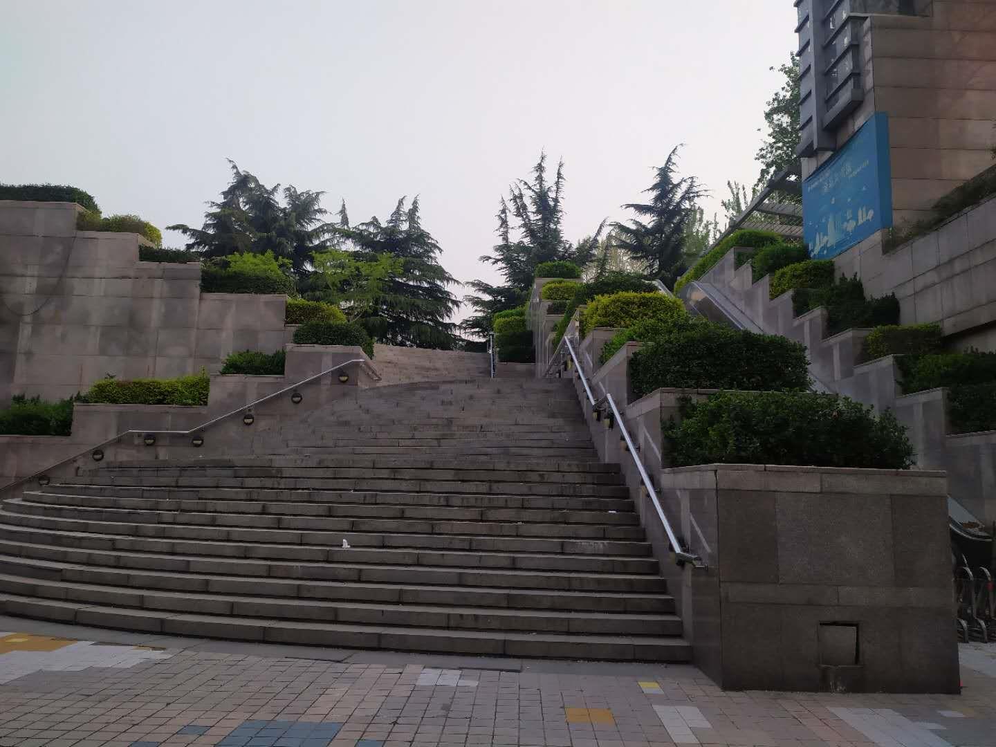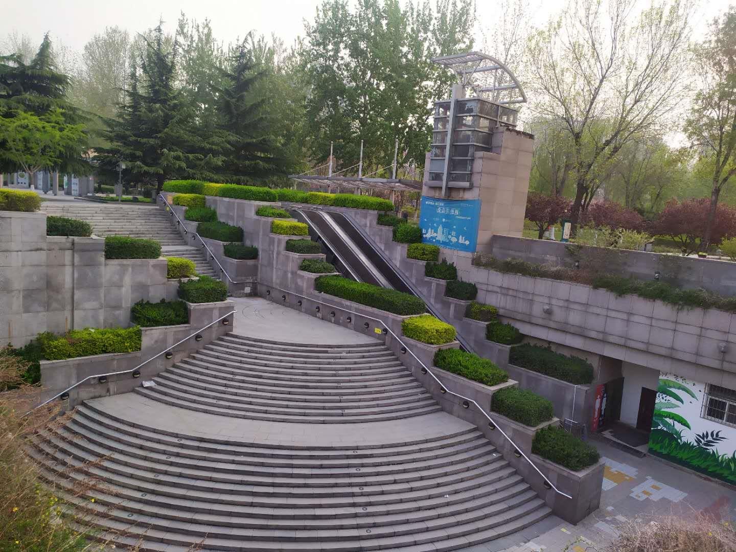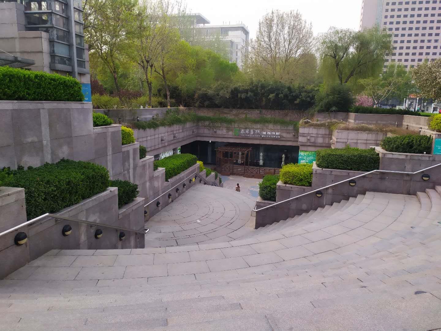 此处是地下书城的入口处,下面可以买书、就餐等,可惜在疫情期间都没有开门,也没有人,不过这下沉式的花台配上植物,层层叠叠,值得一观,