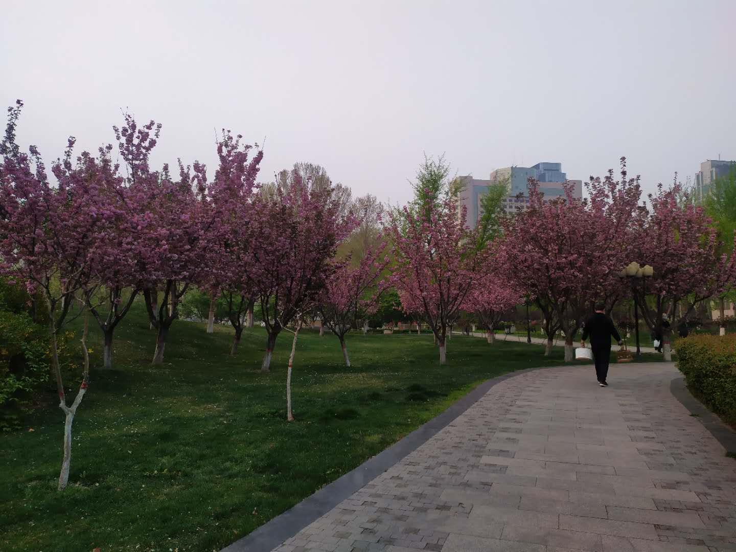 在广场东侧的健身步道最南侧转弯处有一大片樱花,形成樱花林,花朵开得又浓又密,引得许多路人纷纷来拍照。